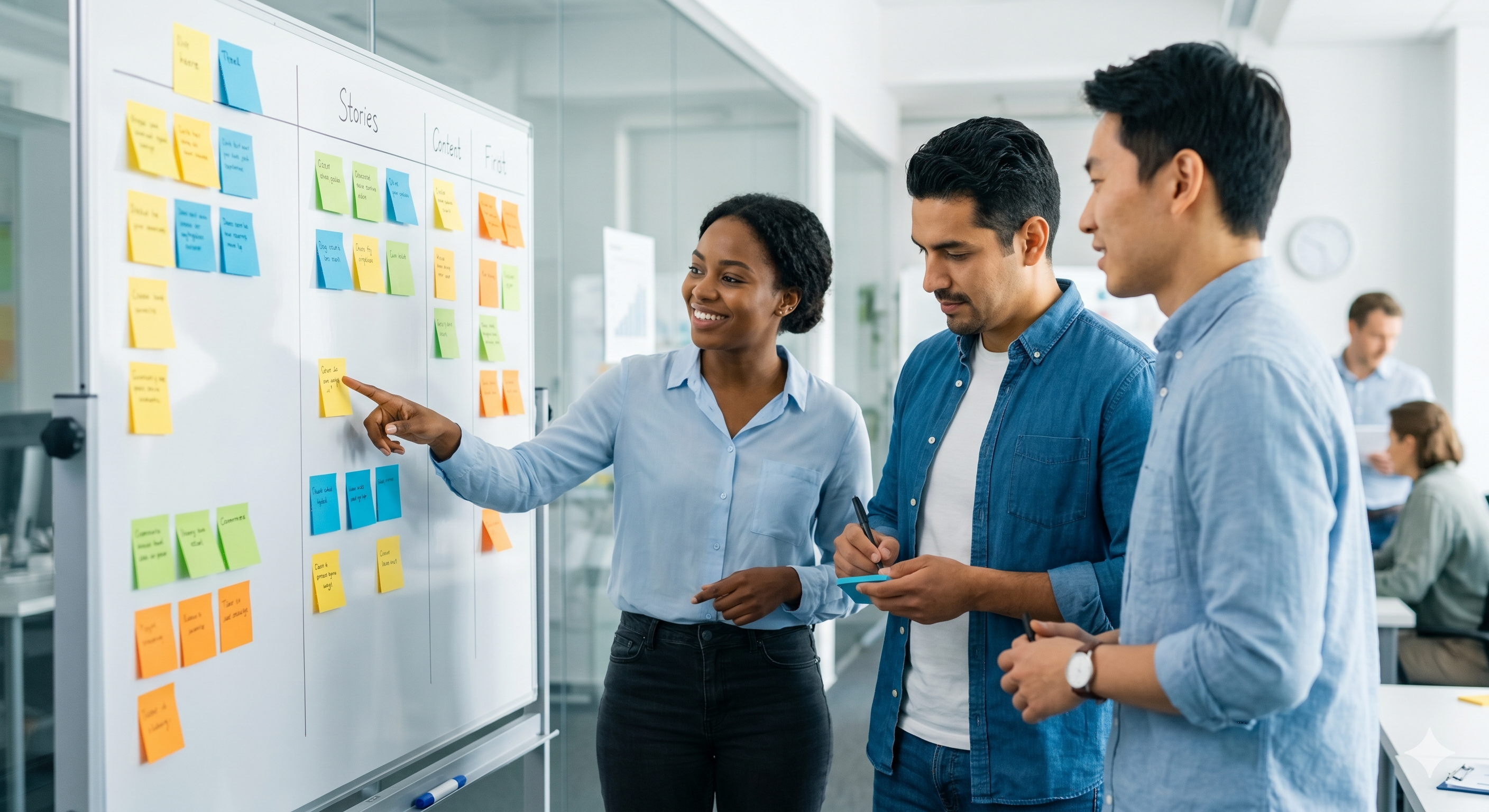 (A diverse Agile team collaborating and arranging user story sticky notes on a shared board.)