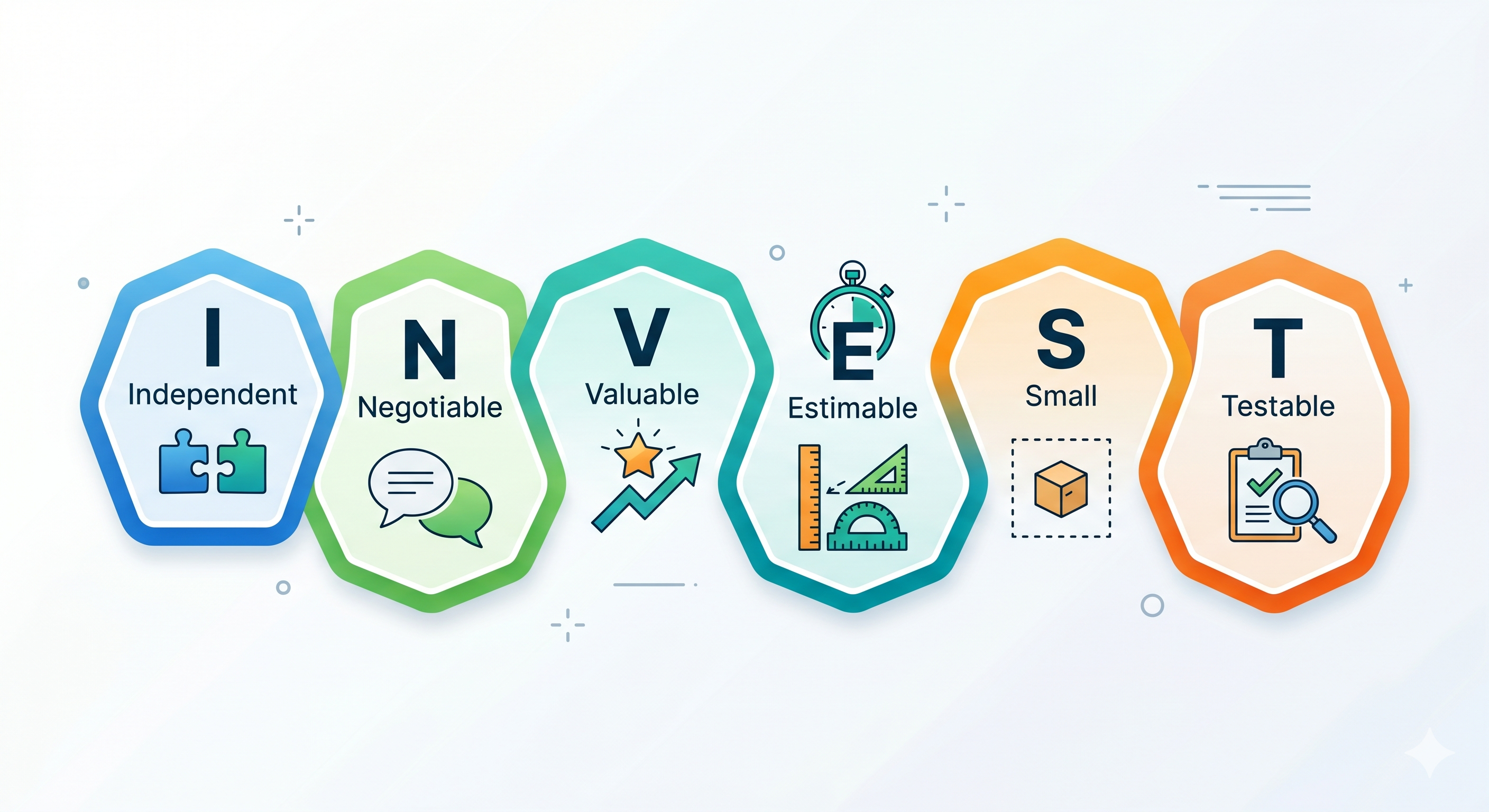 (An elegant infographic detailing the INVEST mnemonic (Independent, Negotiable, Valuable, Estimable, Small, Testable) for effective user stories.)