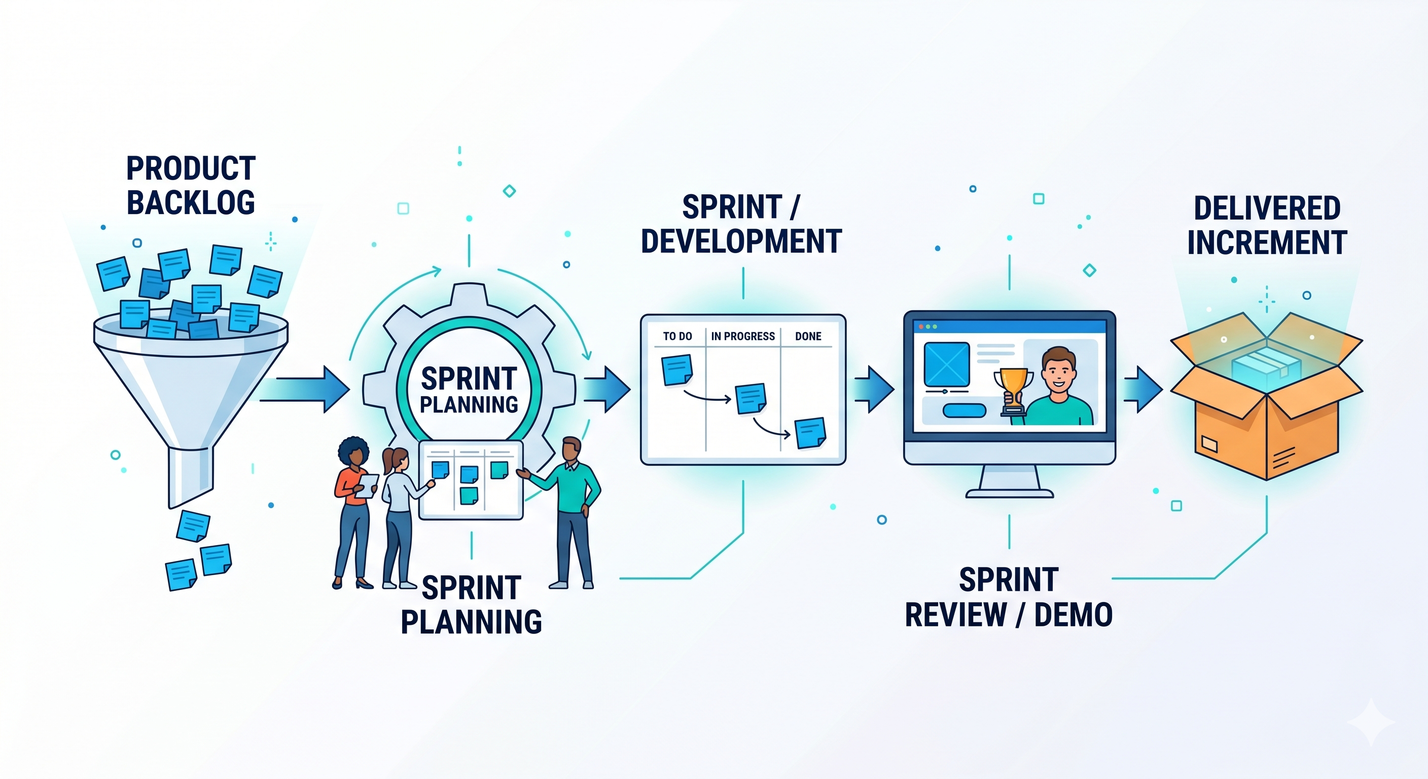 (A process flowchart moving a user story from the Product Backlog, through Sprint Planning and the Development Sprint, to the final Delivered Increment.)